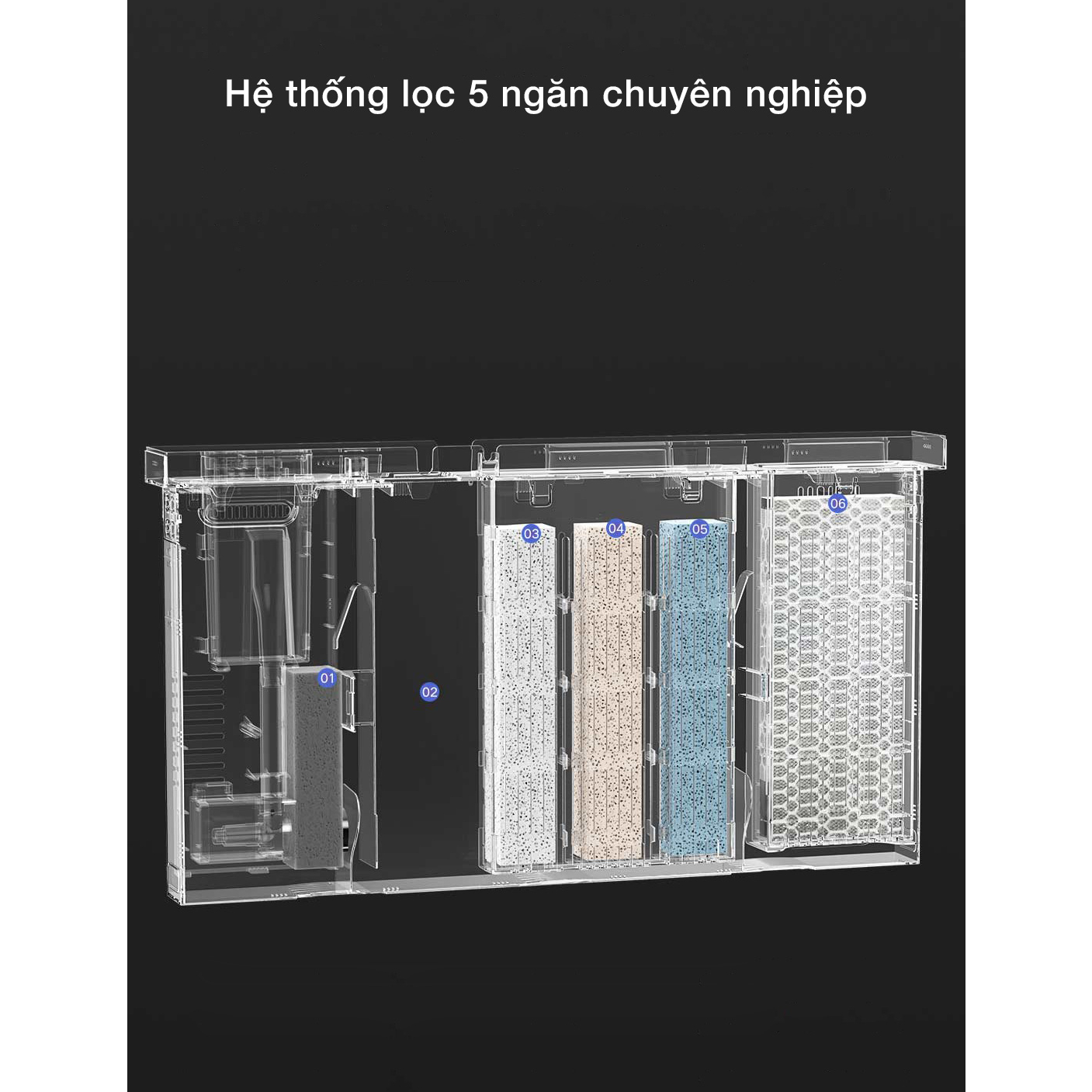 * Hệ thống lọc ngược 5 giai đoạn kết hợp với máy bơm chống tắc nghẽn, tự làm sạch. Thực hiện hiệu quả quá trình lọc vật lý và nuôi cấy vi khuẩn, nhanh chóng thiết lập một hệ sinh thái trong bể và giảm tần suất thay nước;