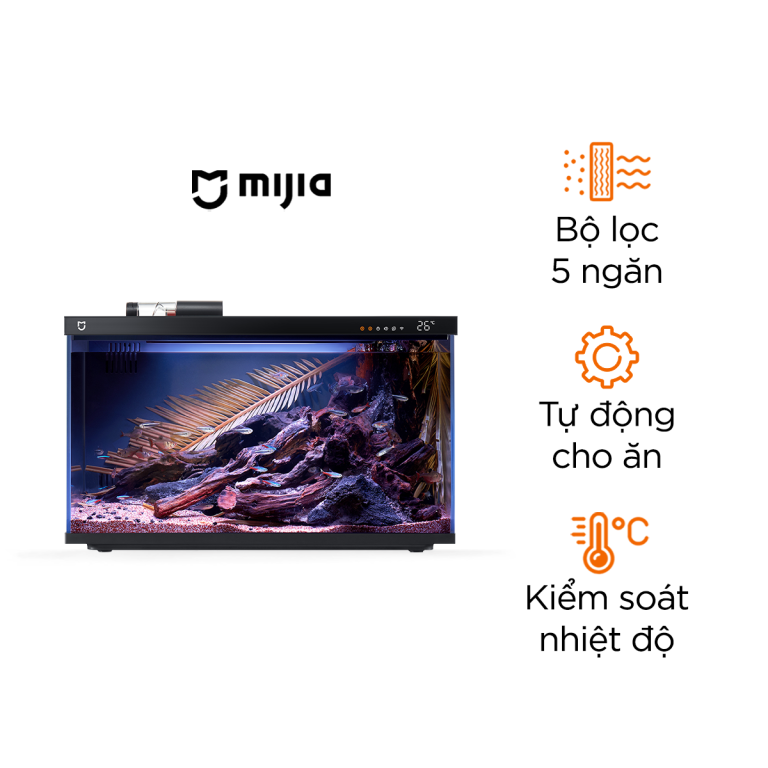 * Theo dõi nhiệt độ theo thời gian thực bằng App điều khiển Mi Home (có thể mua thêm thanh sưởi nếu cần) giúp cho bể có thể nuôi cả 3 loại: cá nước lạnh, cá nhiệt đới, cá nước ấm