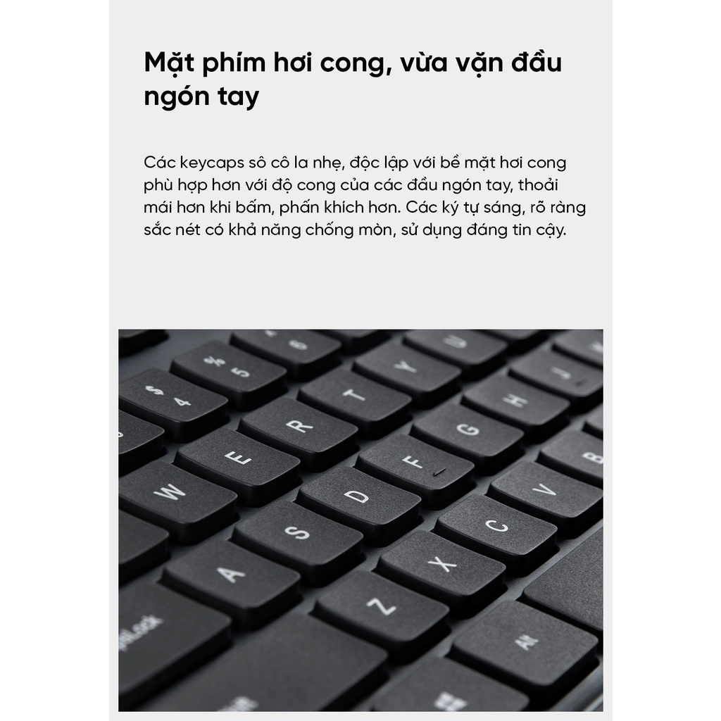 Thiết kế các phím bấm với bề mặt hơi cong sẽ phù hợp hơn với dạng vòng cung của đầu ngón tay cho cảm giác bấm thoải mái và linh hoạt. Các kí tự được khắc laser rõ ràng, sắc nét chống mài mòn tốt. Hơn nữa bàn phím không dây Xiaomi cũng được thiết kế với góc nghiêng 6 độ phù hợp hơn với góc đặt của lòng bàn tay và cổ tay, mang đến tư thế bấm thoải mái và tự do, ít bị mỏi hơn cho người dùng.