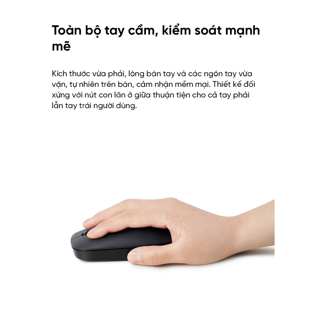 Con chuột trong bộ chuột không dây Xiaomi WXJS01YM được trang bị kết cấu khá gọn nhẹ chỉ khoảng 60g. Thiết kế đối xứng với bánh lăn giữa cũng giúp thao tác xử lý thoải mái hơn và có thể linh hoạt sử dụng cả tay trái và tay phải. Kết cấu toàn bộ chuột với kích thước trung bình, vừa vặn trong lòng bàn tay sẽ giúp người dùng dễ dàng kiểm soát các chuyển động, định vị, giảm tối đa áp lực lên ngón tay và cổ tay, tránh gây mỏi khi sử dụng trong thời gian dài.