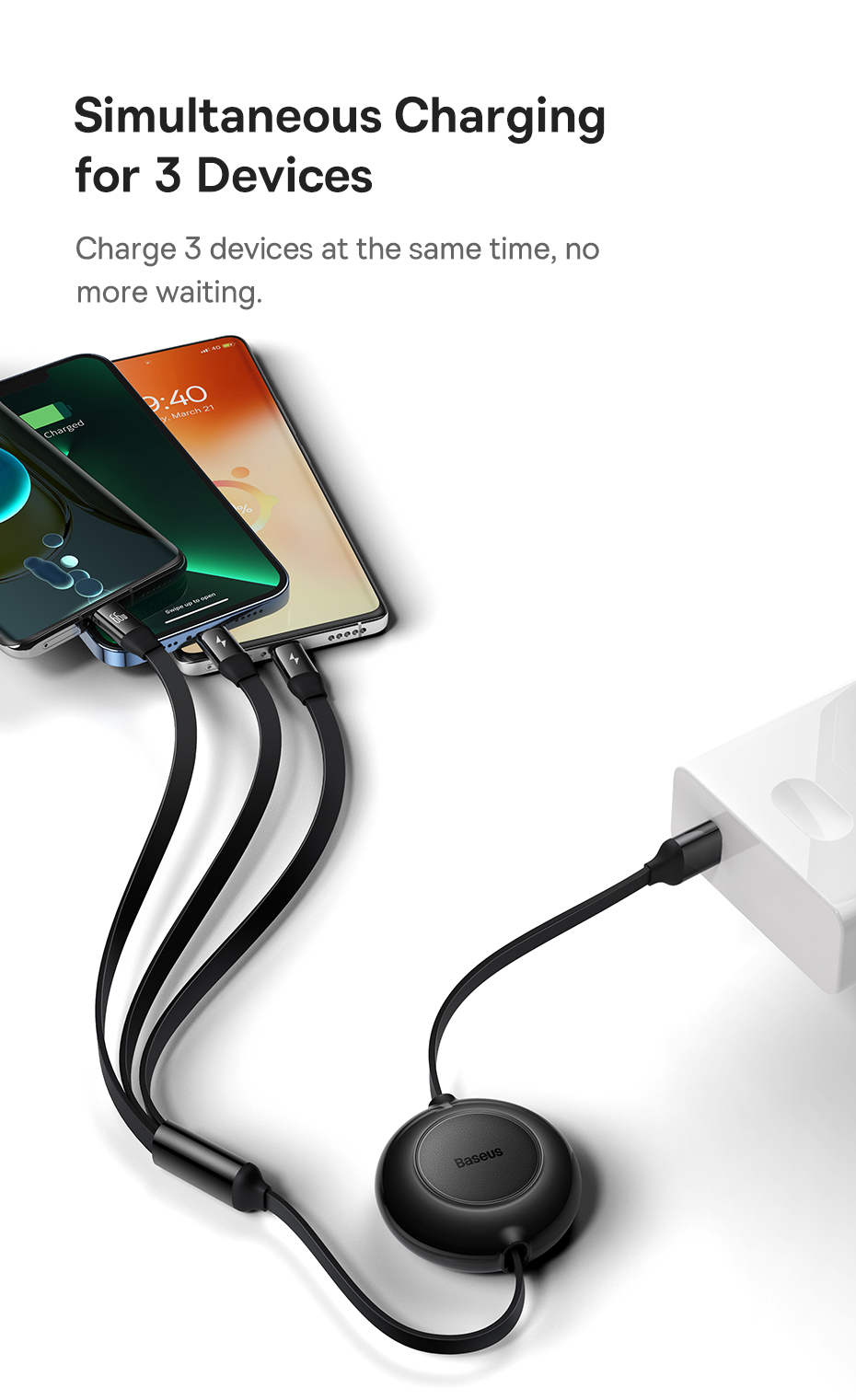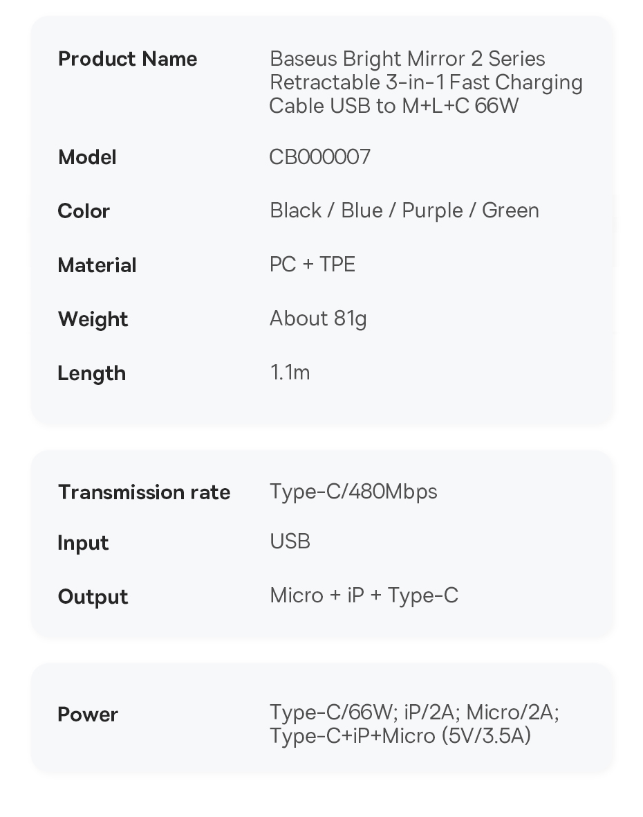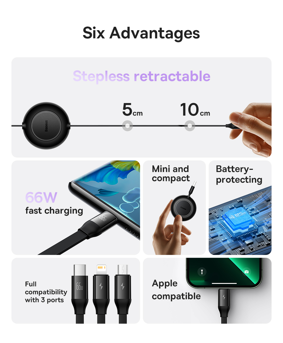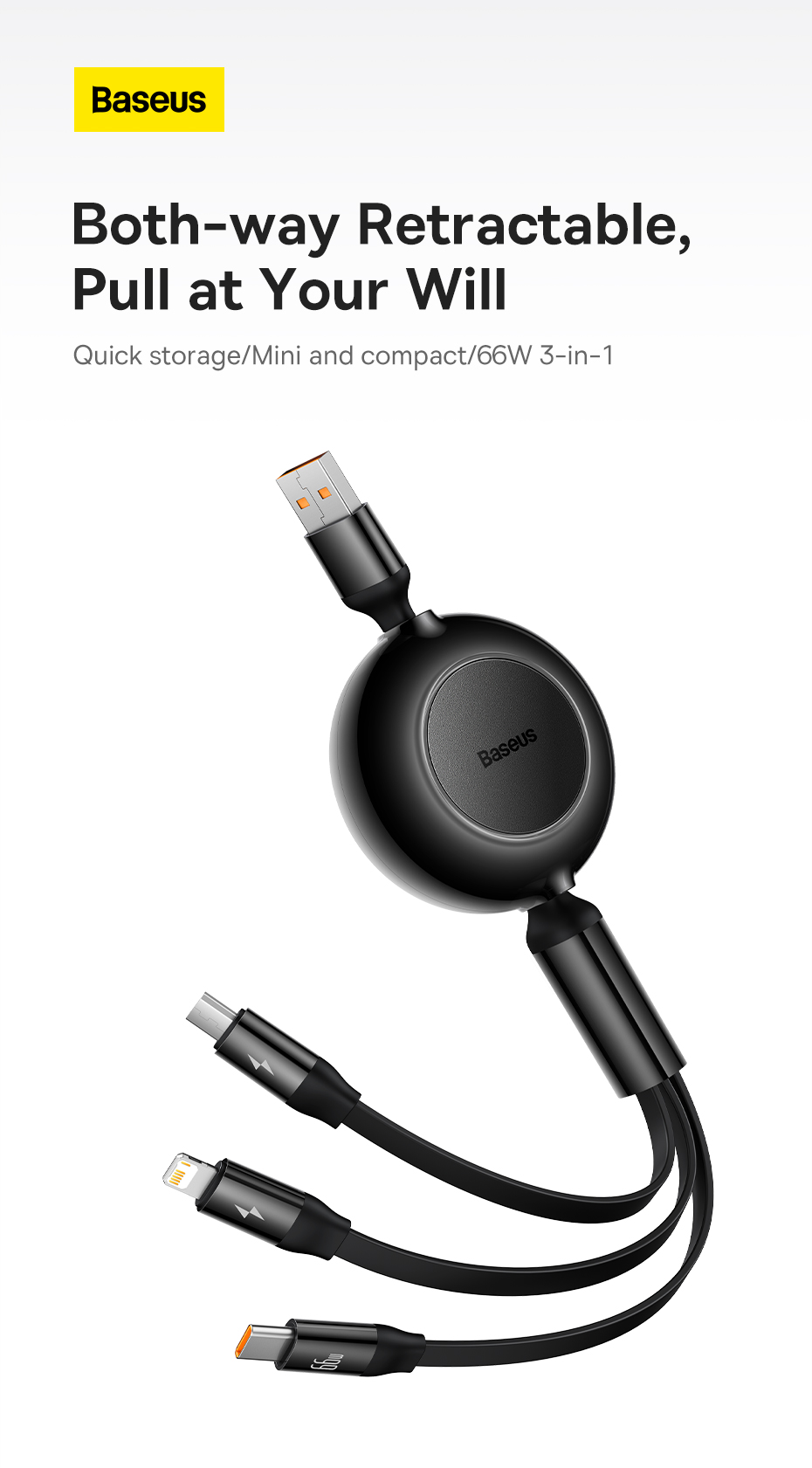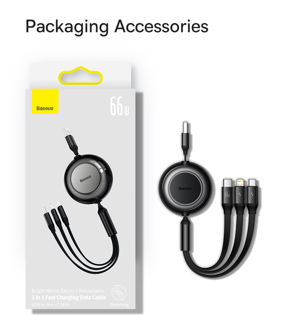 Tính năng cơ bản Cáp Sạc Dây Rút Baseus Bright Mirror 3 in 1 Series 2 66W/100W Retractable Data Cable