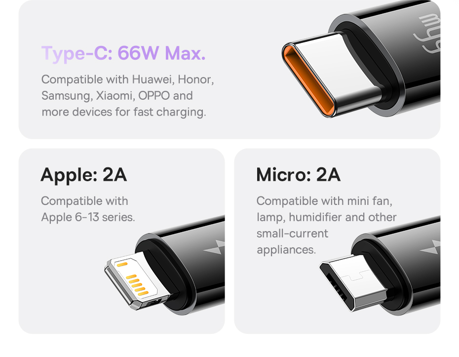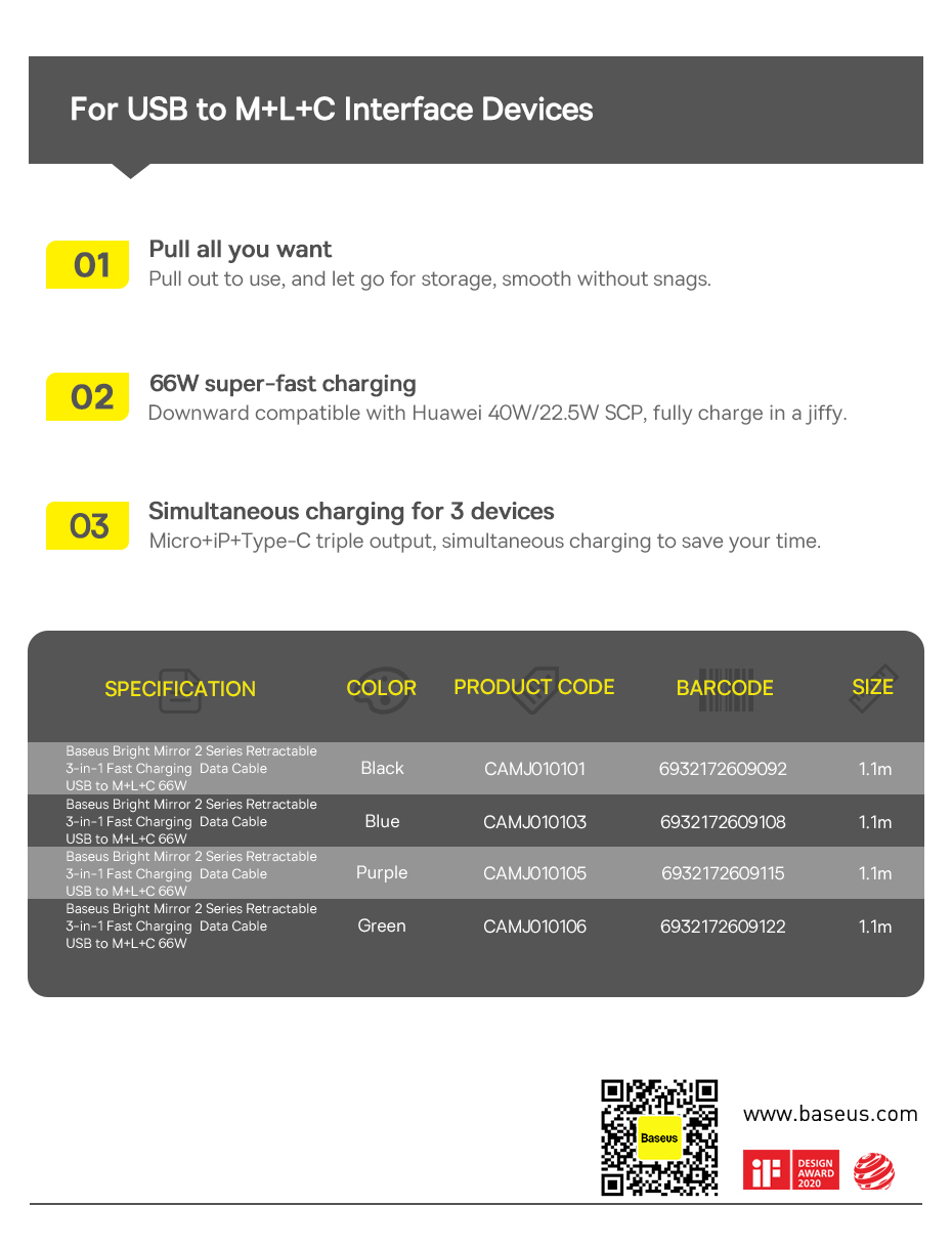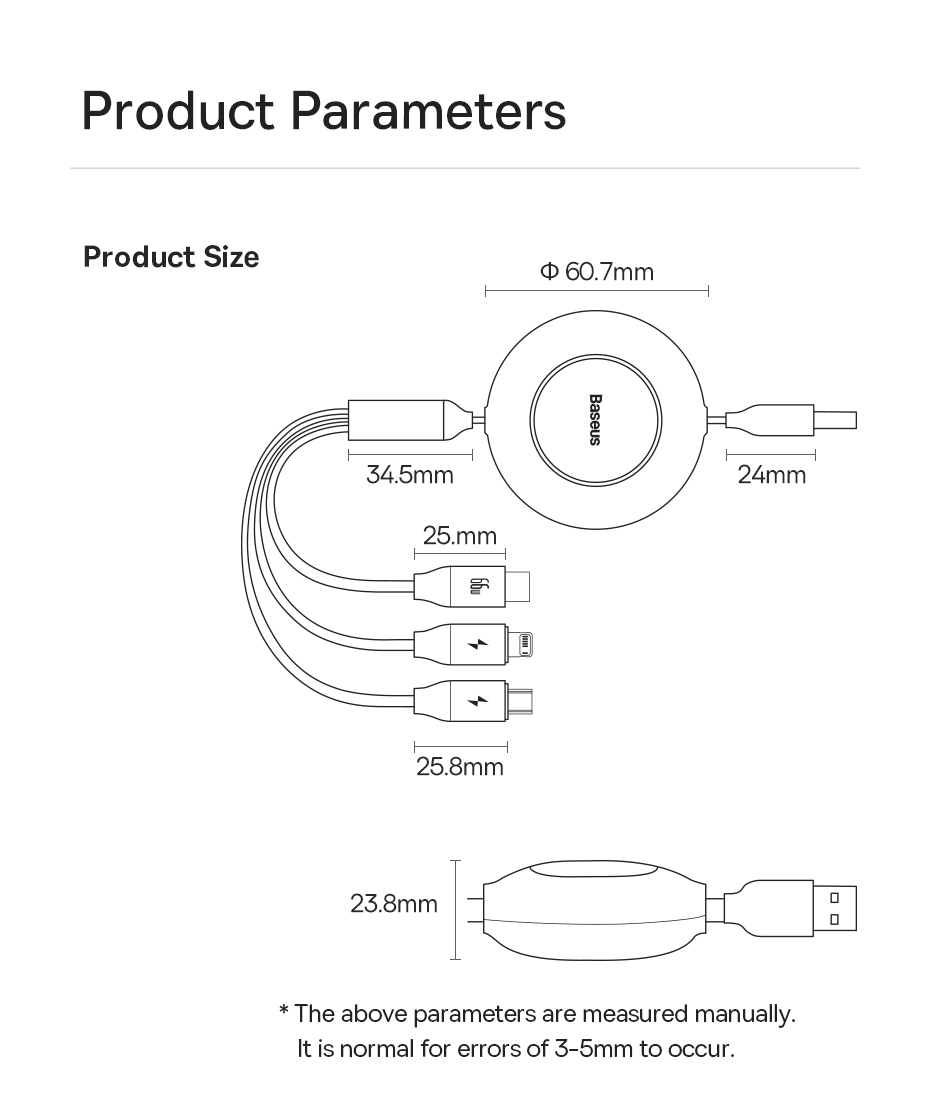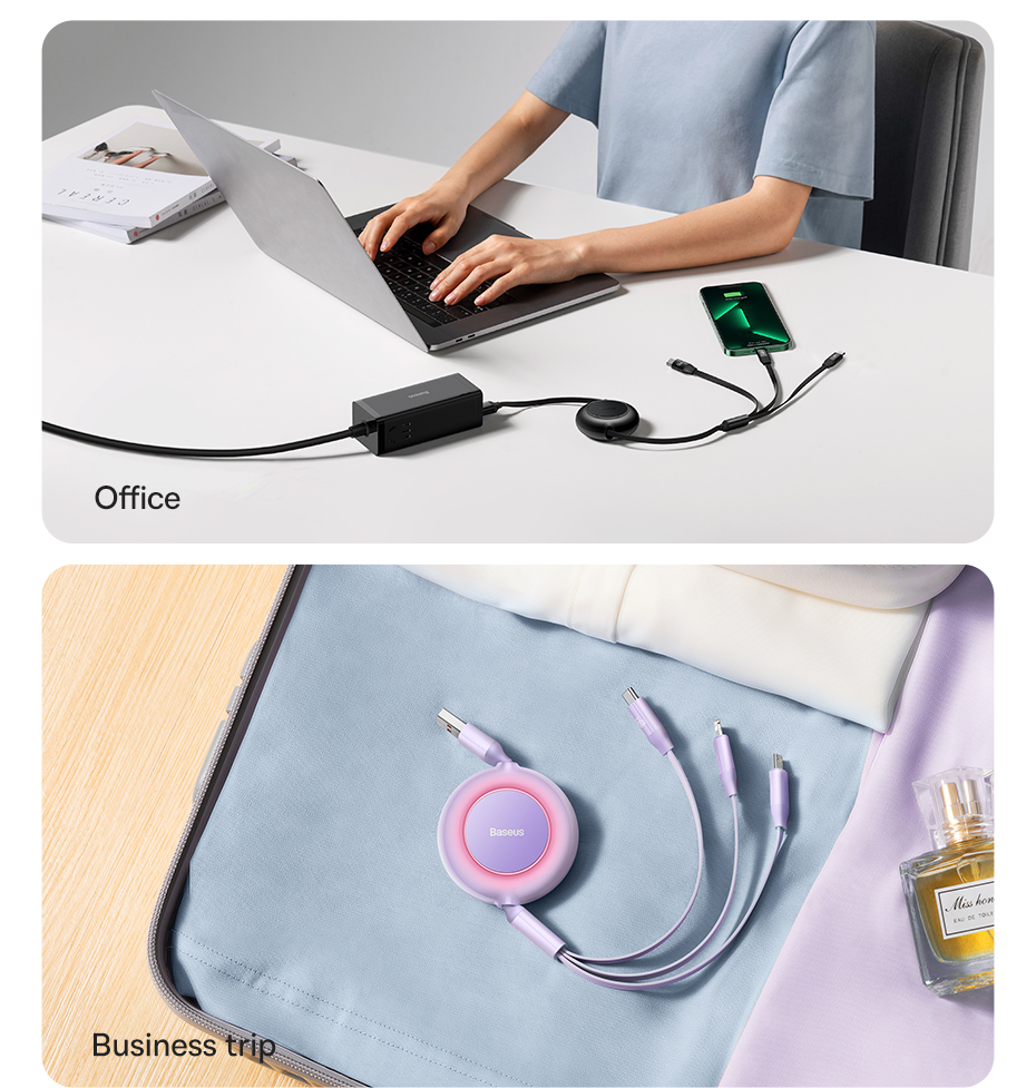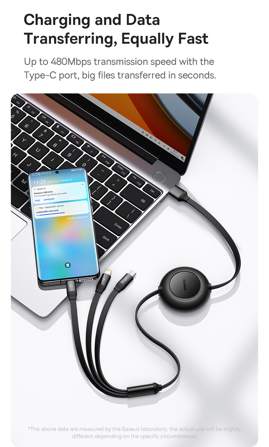 Tính năng cơ bản Cáp Sạc Dây Rút Baseus Bright Mirror 3 in 1 Series 2 66W/100W Retractable Data Cable