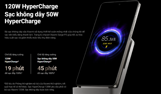 Hệ thống sạc nhanh của thiết bị nổi bật với công nghệ HyperCharge 120W, sạc đầy pin trong thời gian ngắn, đáp ứng nhu cầu năng lượng cao. Tính năng sạc không dây HyperCharge 50W tăng thêm sự tiện lợi, cho phép sạc không cần dây cáp. Máy còn trang bị cổng USB Type-C, mang đến nhiều tùy chọn sạc linh hoạt cho người dùng.