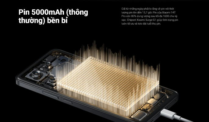 Viên pin 5000 mAh trên Xiaomi 14T Pro không chỉ hứa hẹn thời gian sử dụng ấn tượng khoảng 15 giờ sau mỗi lần sạc mà còn chứng tỏ độ bền đáng kinh ngạc. Theo nhà sản xuất, sau 1600 chu kỳ sạc, pin vẫn duy trì được 80% dung lượng ban đầu. Điều này đồng nghĩa với việc bạn có thể yên tâm sử dụng chiếc điện thoại này trong thời gian dài mà không lo lắng về tình trạng chai pin, đảm bảo trải nghiệm luôn mượt mà và ổn định.