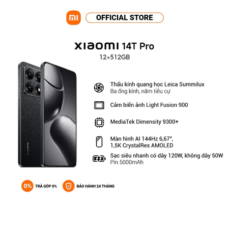 Xiaomi 14T Pro trang bị chip MediaTek Dimensity 9300+ 8 nhân, với 1 nhân 3.4 GHz, 3 nhân 2.85 GHz và 4 nhân 2 GHz, mang lại hiệu suất mạnh mẽ. Cấu hình này giúp máy xử lý tốt các tác vụ nặng, đa nhiệm, chơi game đồ họa cao và chạy ứng dụng nặng mượt mà, nhanh chóng.