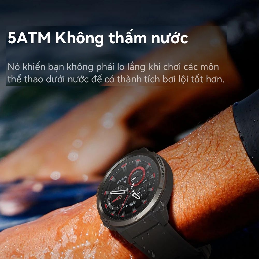 Dòng đồng hồ thông minh GS XPAW008 tới từ thương hiệu Mibro đã đạt tiêu chuẩn 5ATM về khả năng kháng nước và mồ hôi trong quá trình vận động thể thao ngoài trời của người dùng. Tuy nhiên tính năng này không hỗ trợ với các hoạt động như lặn biển, ngâm suối nước nóng với dòng nước sâu.