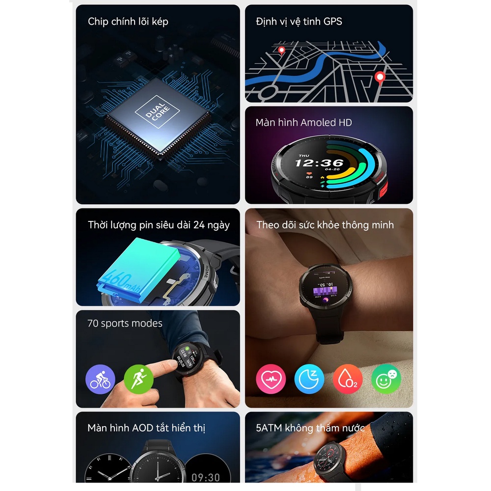 Đồng hồ thông minh Mibro GS XPAW008 sở hữu mặt kính AMOLED HD sắc nét kích thước 1.43 inch, cân nặng nhỏ gọn linh hoạt bao gồm cả dây đeo khoảng 56,5g, viên pin dung lượng 460mAh đáp ứng sử dụng tới 24 ngày ở chế độ hàng ngày, có khả năng theo dõi nhịp tim, chỉ số SPO2 và chất lượng giấc ngủ, đồng thời hỗ trợ theo dõi dữ liệu cơ thể trong khi tập luyện tới 70 môn thể thao phổ biến gồm: bóng đá, bơi lội, đi bộ, chạy bộ, đạp xe và các môn thể dục khác.