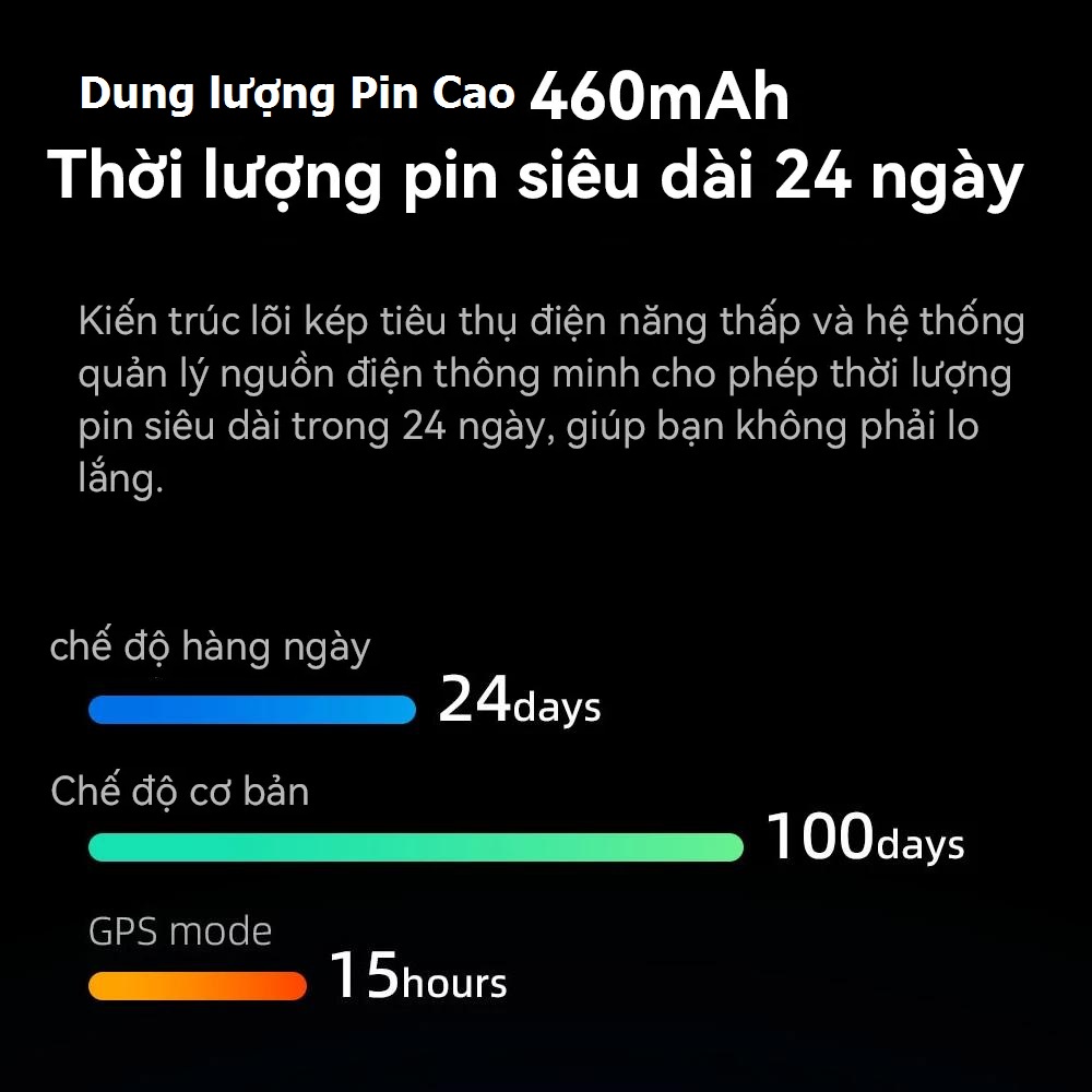Viên pin mật độ cao dung lượng 460mAh với hệ thống quản lý nguồn điện thông minh giúp Mibro XPAW008 có tuổi thọ pin dài, hoạt động tốt tới 24 ngày ở chế độ hàng ngày, 100 ngày nếu ở chế độ cơ bản.