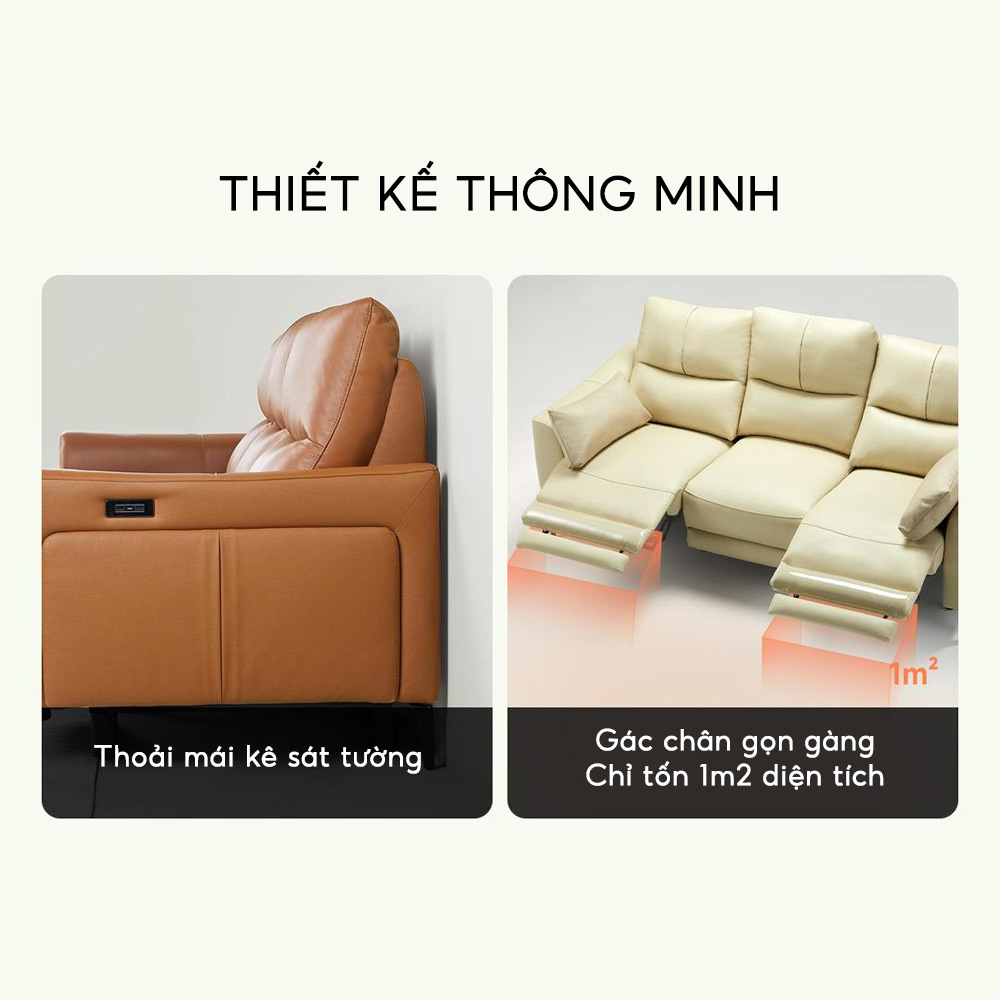Phần đệm gác chân chỉ chiếm tối đa 1m² và có thể mở rộng hoặc gập gọn lại để tiết kiệm không gian. Thiết kế thông minh cho phép bạn vẫn có thể kê ghế sát tường thật gọn gàng mà vẫn thoải mái điều chỉnh góc nghiêng của đệm gác chân.