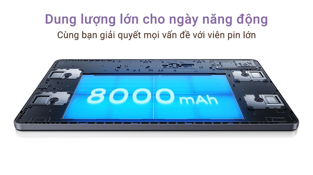 Viên pin khủng dung lượng 8000 mAh, máy tính bảng này có khả năng hoạt động liên tục trong nhiều giờ, cho phép bạn làm việc, chơi game và thưởng thức nội dung giải trí mà không gặp gián đoạn trong một thời gian dài.