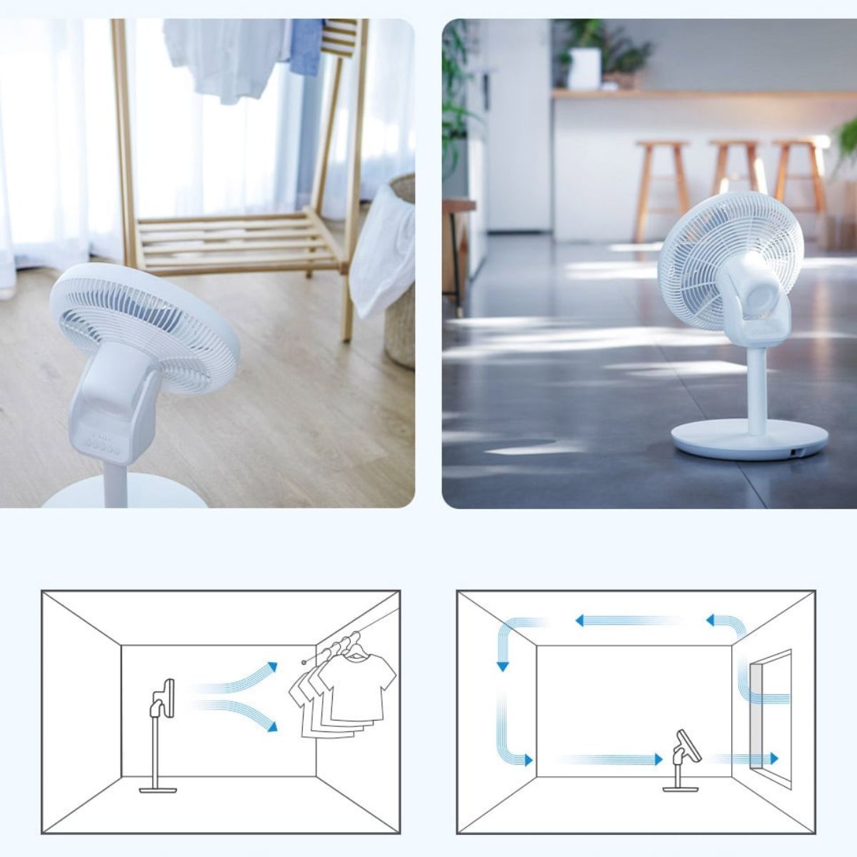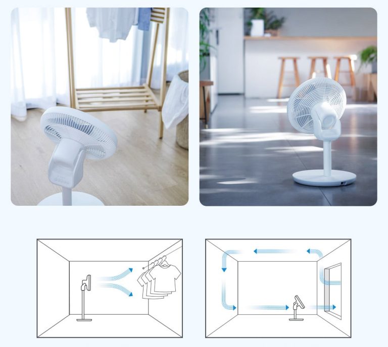 Quạt hỗ trợ xoay ngang 120° và xoay dọc lên đến 100°, tạo luồng gió 3D bao phủ không gian hiệu quả. Lưu lượng gió đạt khoảng 23.3 m³/phút, với tầm thổi xa tới 10m, đủ để làm mát những khu vực rộng. Thiết kế luồng khí liên tục giúp gió lưu thông mượt mà, kết hợp cơ chế xoay đa hướng để phân phối không khí đồng đều trong phòng.