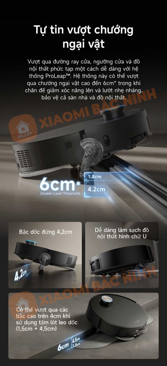 Robot hút bụi lau nhà Dreame X50 Master được trang bị hệ thống ProLeap™, cho phép vượt qua các vật cản như đường ray cửa, ngưỡng cửa hay đồ nội thất có độ cao lên đến 6cm một cách dễ dàng. Nhờ đó, robot có thể làm sạch hiệu quả mà không làm hư hại sàn nhà hay va chạm mạnh với đồ nội thất.