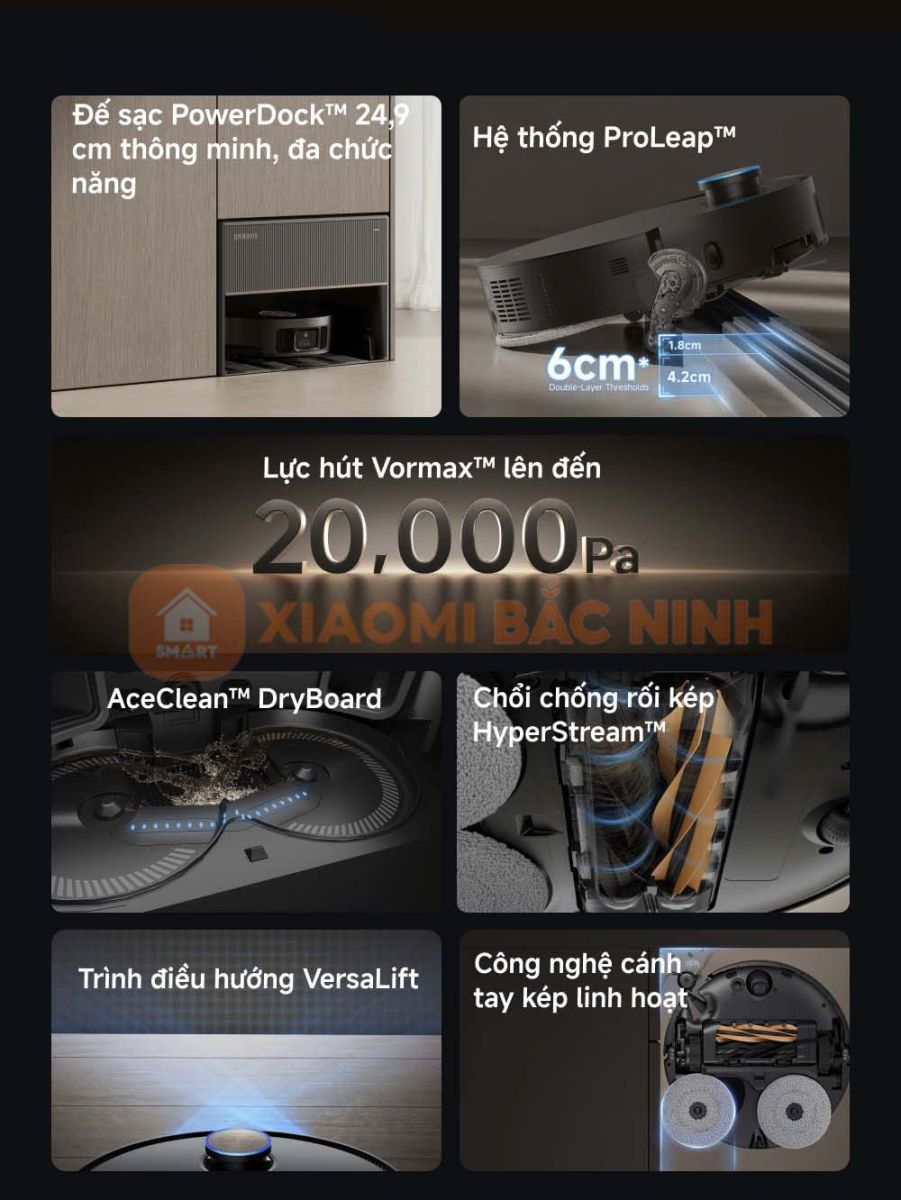 Robot hút bụi lau nhà Dreame X50 Master được trang bị những công nghệ đột phá, mang đến trải nghiệm làm sạch toàn diện. Với trạm sạc thông minh PowerDock™, hệ thống hút mạnh mẽ Vormax™ 20.000Pa, chổi kép chống rối HyperStream™, cùng công nghệ điều hướng VersaLift, thiết bị này không chỉ tối ưu hóa hiệu suất làm sạch mà còn định nghĩa lại sự tiện nghi trong ngôi nhà hiện đại.