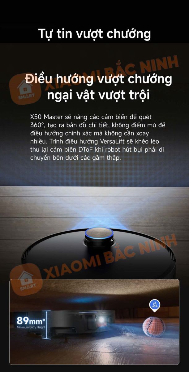Công nghệ VersaLift™ giúp Dreame X50 Master có thể leo lên các bậc cao đến 6cm một cách linh hoạt và đổi hướng nhanh chóng khi gặp chướng ngại vật. Điều này đảm bảo robot luôn hoạt động trơn tru, không bị mắc kẹt hay gián đoạn trong quá trình làm sạch.