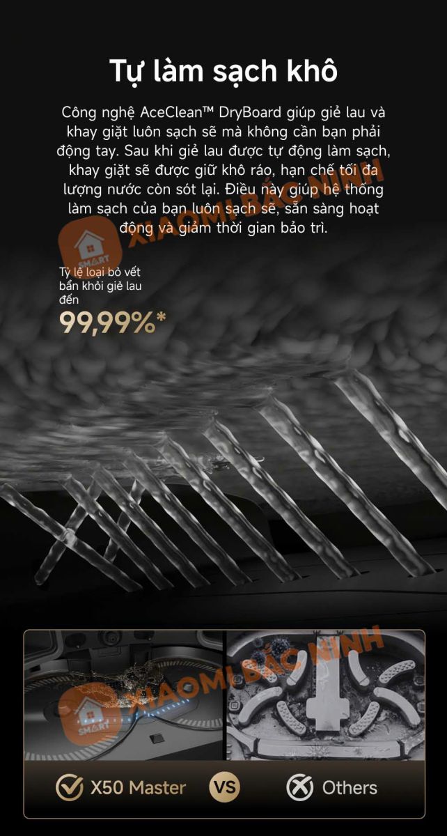 Ngoài ra, Dreame X50 Master còn tích hợp công nghệ AceClean™ DryBoard, giúp tự động làm sạch giẻ lau và khay giặt giẻ sau mỗi lần sử dụng. Hệ thống này giúp giữ cho khay luôn khô ráo, hạn chế nước dư thừa, giúp giảm thiểu mùi hôi và đảm bảo cho robot luôn trong trạng thái sẵn sàng hoạt động. Đặc biệt công nghệ này có khả năng loại bỏ đến 99,99% vết bẩn trên giẻ lau, giúp cho robot luôn trong tình trạng tốt nhất cho phiên làm việc tiếp theo.