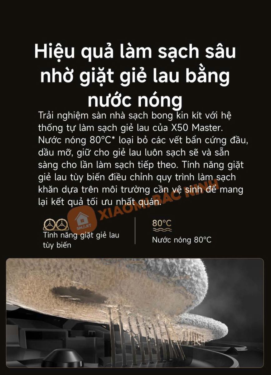 Với khả năng giặt giẻ lau bằng nước nóng 80°C, Dreame X50 Master không chỉ loại bỏ bụi bẩn mà còn tiêu diệt vi khuẩn, đảm bảo giẻ lau luôn sạch sẽ trước mỗi lần sử dụng.