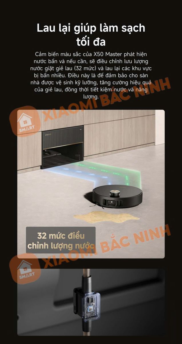 Cảm biến màu sắc của Dreame X50 Master có thể nhận diện nước bắn và tự động điều chỉnh lưu lượng nước giặt giẻ lên đến 32 mức, giúp làm sạch kỹ lưỡng hơn ở những khu vực bẩn nhiều, đồng thời tiết kiệm nước và năng lượng.
