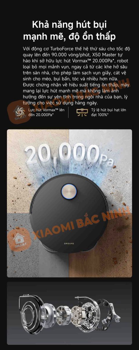Robot hút bụi lau nhà Dreame X50 Master được trang bị động cơ TurboForce thế hệ thứ sáu, đạt tốc độ quay lên đến 90.000 vòng/phút, tạo ra lực hút Vormax™ lên đến 20.000Pa. Nhờ công suất mạnh mẽ này, robot có thể dễ dàng hút sạch mọi loại bụi bẩn, từ vụn giấy, cát vệ sinh cho mèo đến tóc rối và bụi mịn trong các khe sâu.