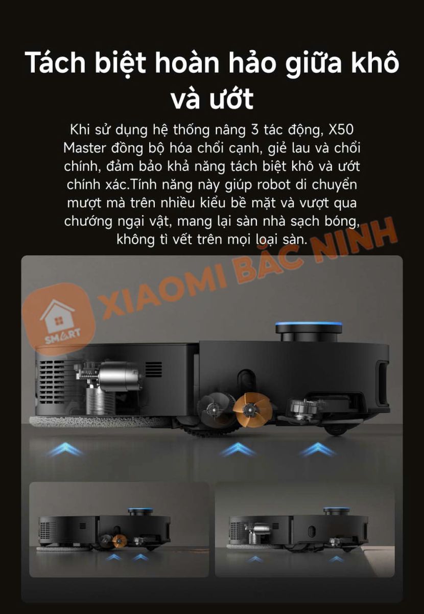 Nhờ có hệ thống nâng 3 tác động, robot Dreame X50 Master có thể đồng bộ hoá chổi cạnh, giẻ lau và chổi chính, giúp tách biệt giữa việc làm sạch khô và ướt. Tính năng này đảm bảo robot di chuyển mượt mà trên mọi loại sàn, vượt qua chướng ngại vật mà không làm lan bụi bẩn sang các khu vực khác.