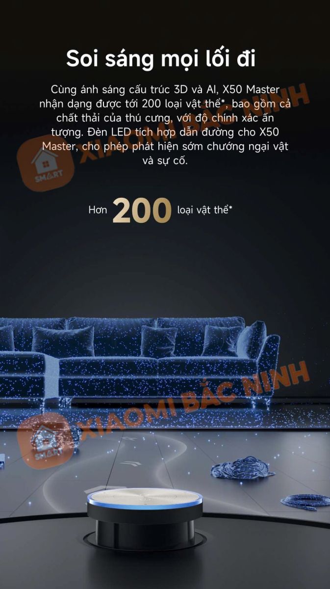 Nhờ tích hợp công nghệ AI và cảm biến ánh sáng 3D, robot Dreame X50 Master có thể nhận diện lên đến 200 loại vật thể khác nhau, bao gồm dây điện, giày dép hay các vật cản nhỏ khác. Hệ thống đèn LED thông minh giúp cho robot soi sáng lối đi, phát hiện sớm chướng ngại vật để tránh va chạm, đảm bảo quy trình làm sạch thông minh và chính xác hơn.
