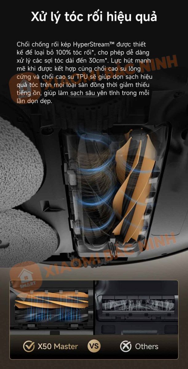Một trong những điểm đột phá của robot hút bụi lau nhà Dreame X50 Master chính là bộ chổi chống rối kép HyperStream™, giúp giải quyết triệt để tình trạng tóc quấn vào chổi, giảm thiểu thời gian bảo trì. Được thiết kế chuyên biệt, hệ thống chổi này có thể loại bỏ 100% tóc rối, kể cả những sợi dài đến 30cm.