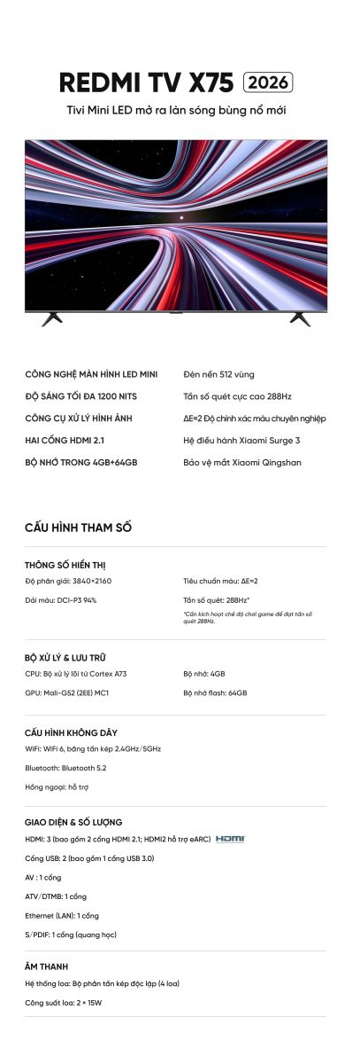 Tivi Xiaomi Redmi X75 Miniled -75 inch Ram 4/64Gb 2026 độ sáng 1200nits 288Hz