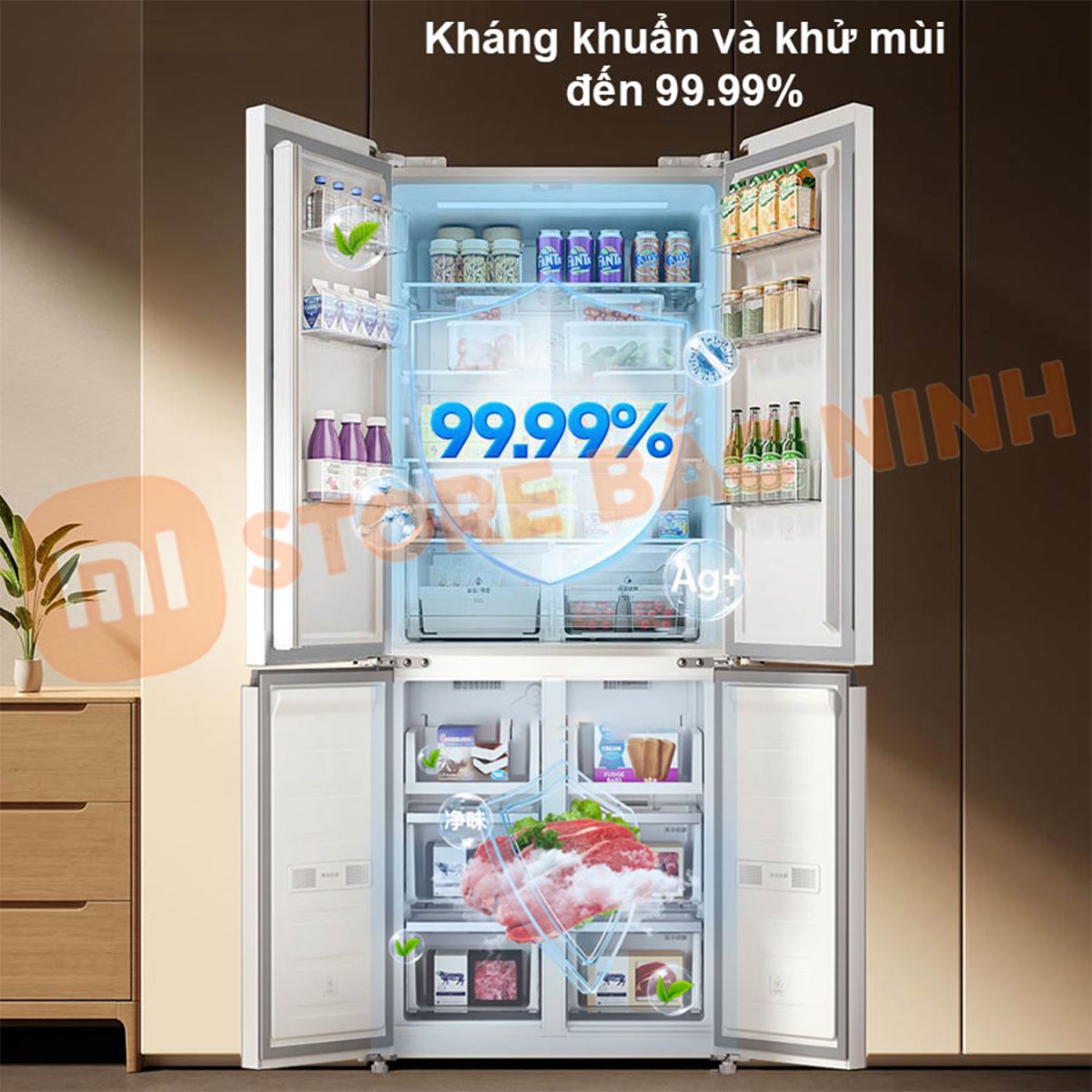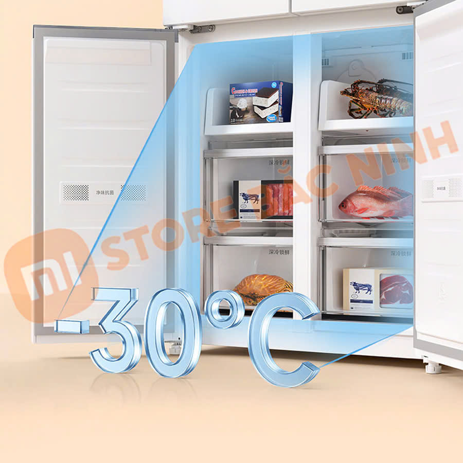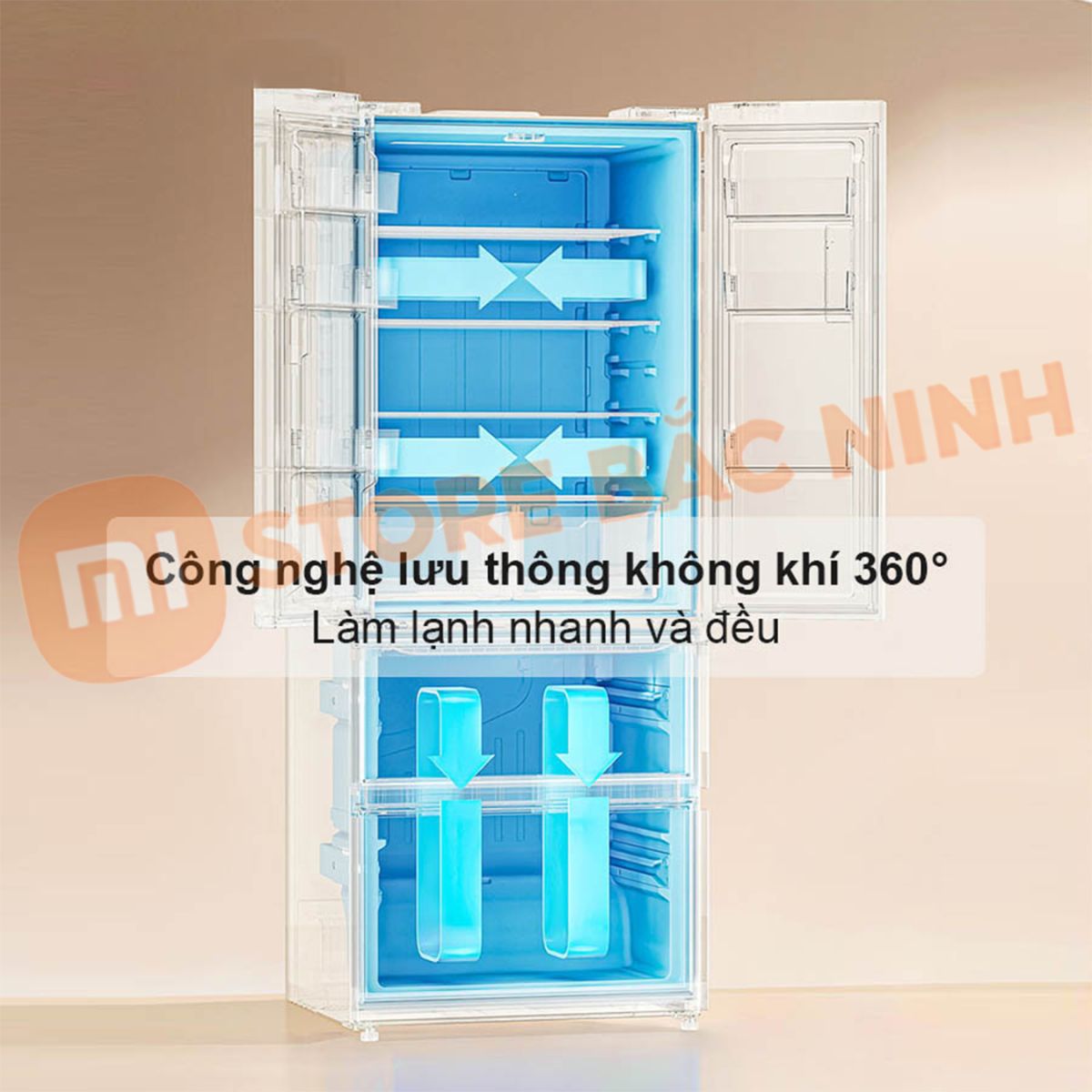 Tủ lạnh Mijia Fresh Cross Ice Crystal 439L sử dụng công nghệ tuần hoàn làm mát không khí 360 độ. Công nghệ này giúp làm lạnh nhanh và đồng đều mà không cần rã đông, đảm bảo thực phẩm được bảo quản tốt nhất và giữ được độ tươi ngon lâu dài. Với hệ thống làm mát này, bạn sẽ không phải lo lắng về việc thực phẩm bị đóng băng không đều hay mất đi chất lượng.