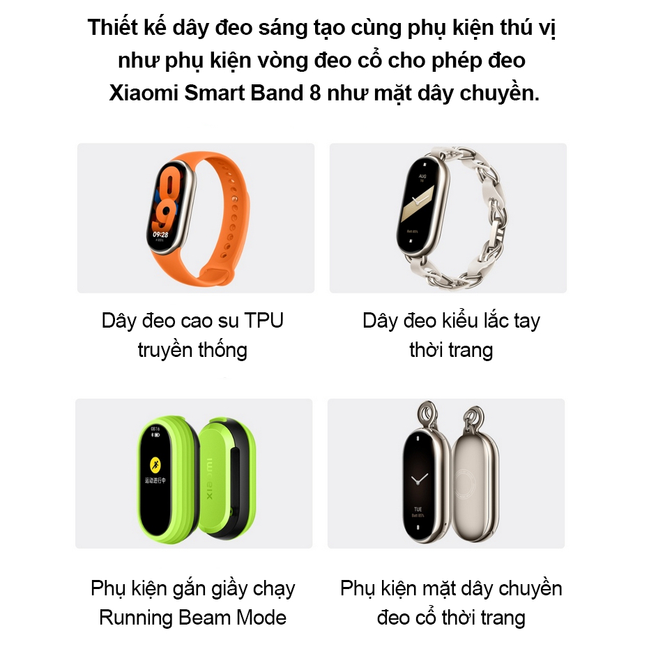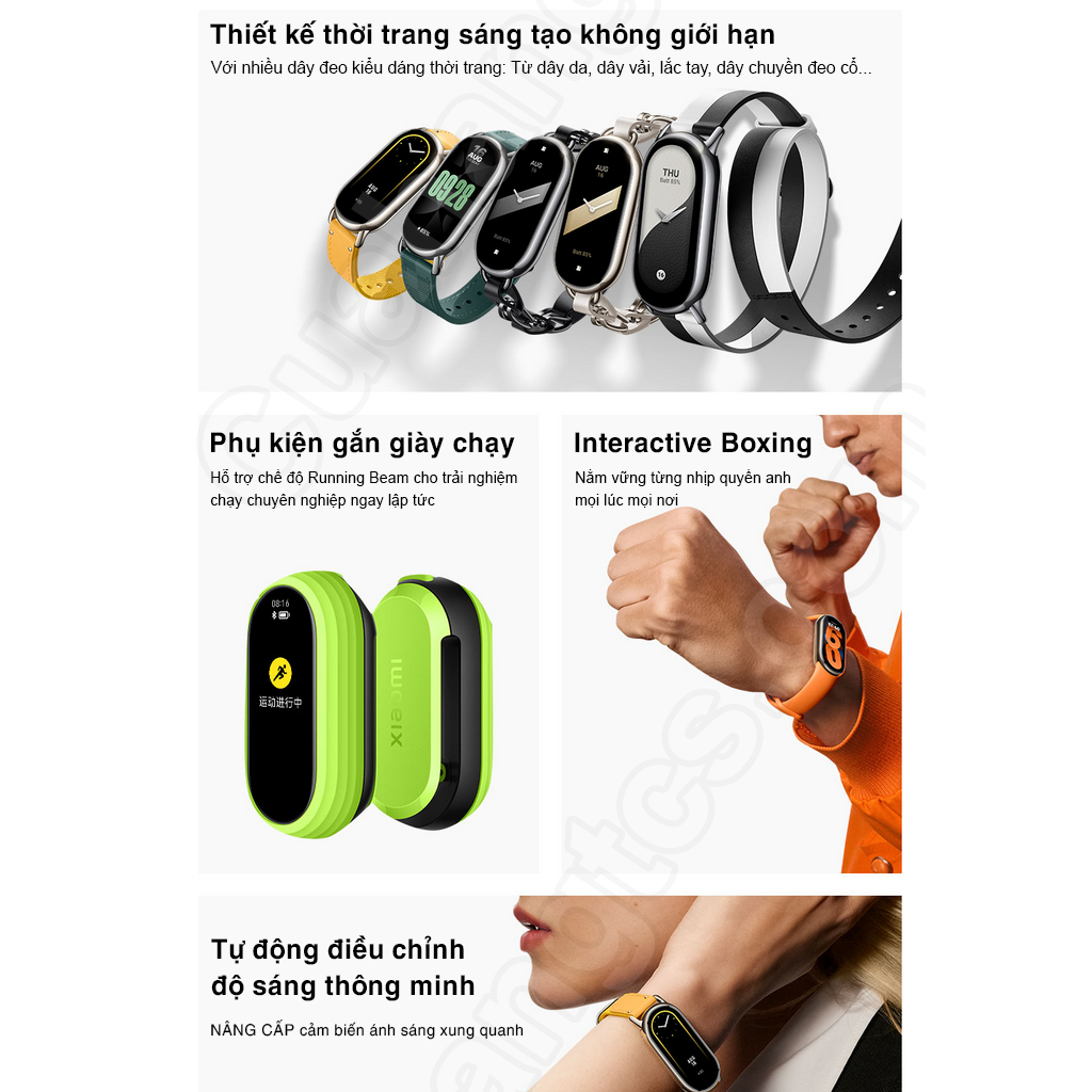 - Mi Band 8 cũng sở hữu nhiều tiện ích của một chiếc đồng hồ thông minh, sẵn sàng đồng hành cùng bạn trong mọi hoạt động hằng ngày như báo thức, thời tiết, nâng cổ tay sáng màn hình, rung thông báo, từ chối cuộc gọi, nhắc nhở sự kiện,