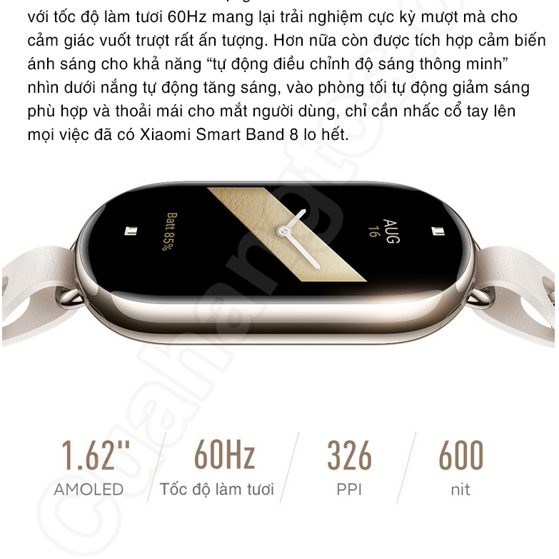 - Màn hình cũng được nâng cấp độ sáng lên 600 nits, cho phép xem nội dung rõ ràng trong nhiều điều kiện sáng. Đồng thời, Mi Band 8 cũng hỗ trợ tính năng mới tự động điều chỉnh độ sáng phù hợp với môi trường xung quanh, giúp tiết kiệm năng lượng hơn.